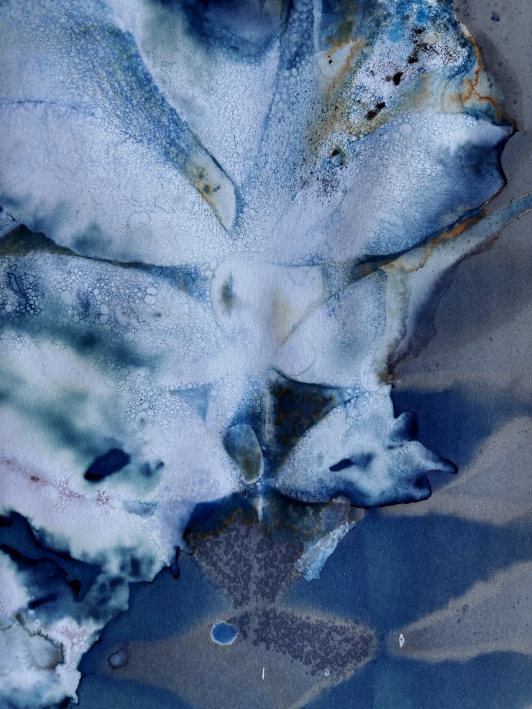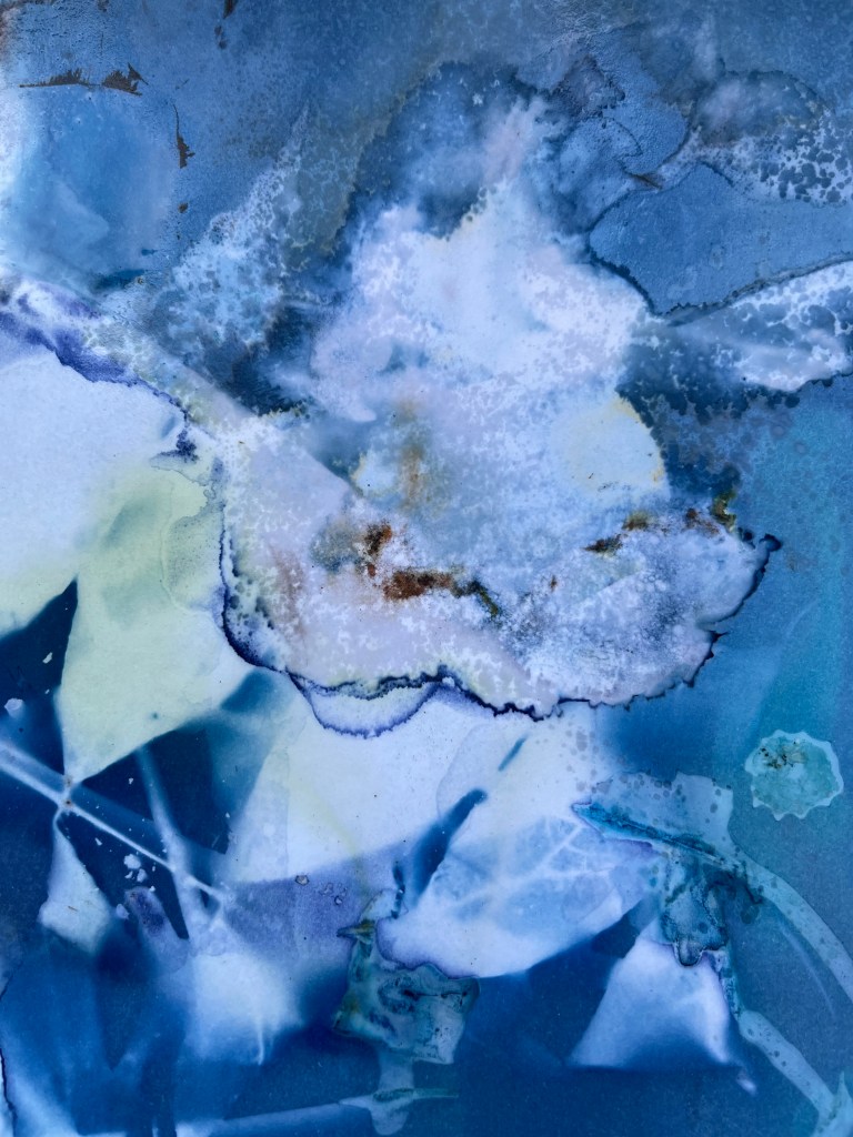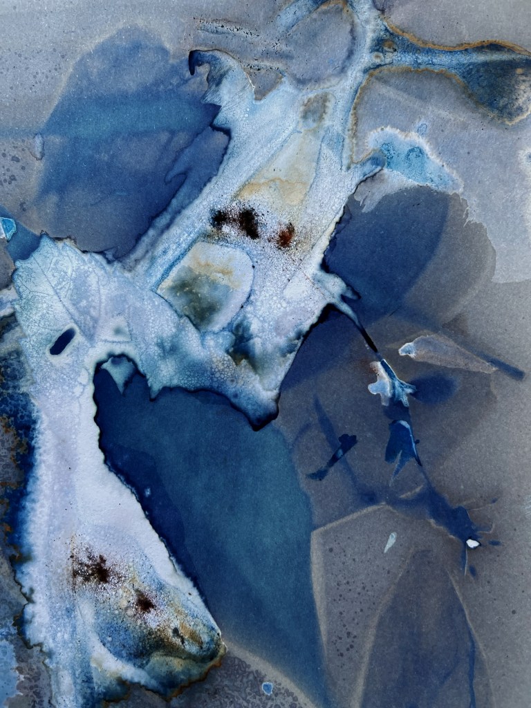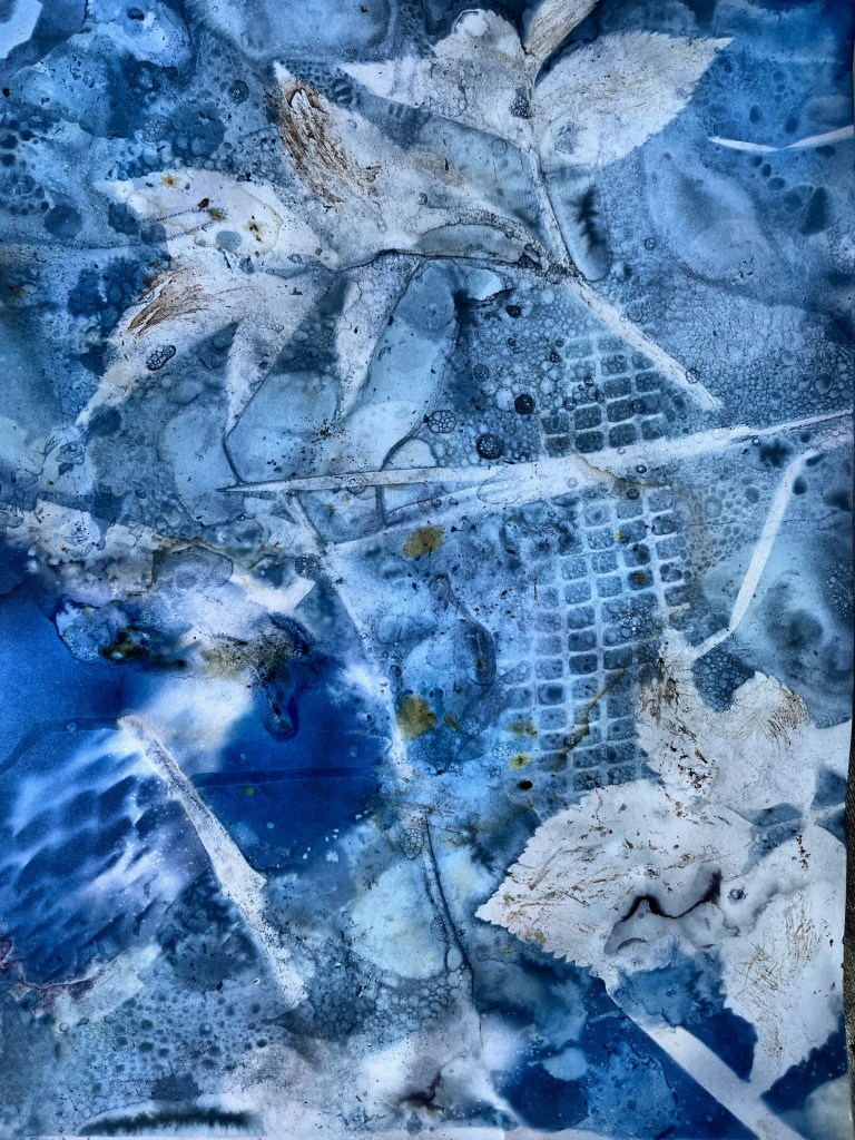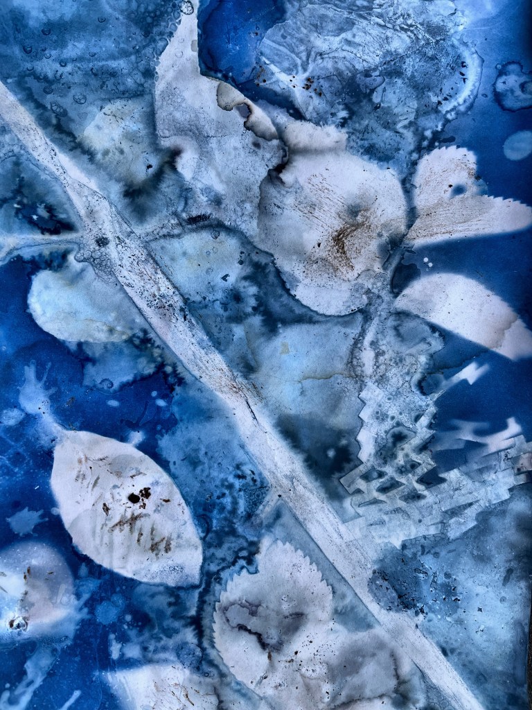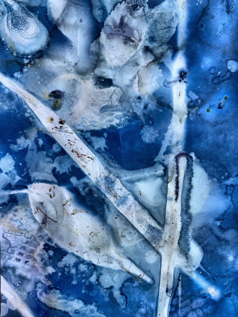 Cyanotypes with their deep blue hues and organic textures, naturally evoke the ebb and flow of water. The marks and silhouettes of found objects tell a layered story, from something quite beautiful to something unsettling about what the river holds beneath. A visual story that explores the fragility of our ecosystems in the face of pollution, drought and climate change.