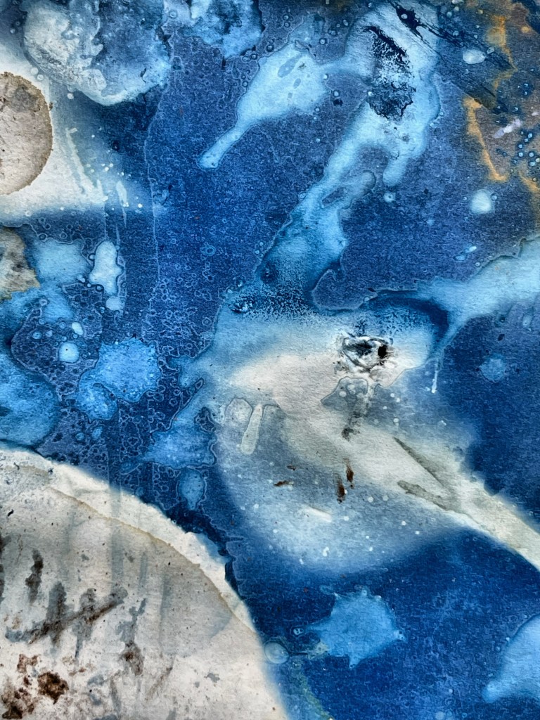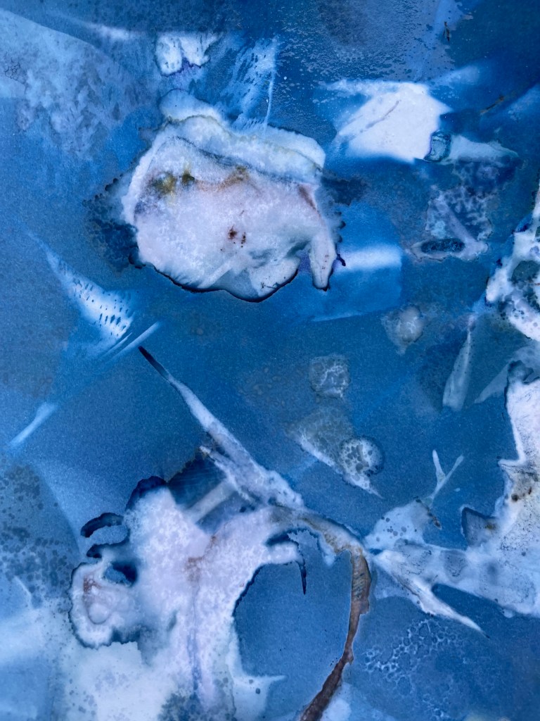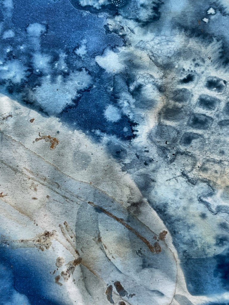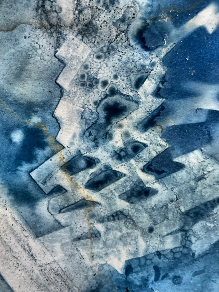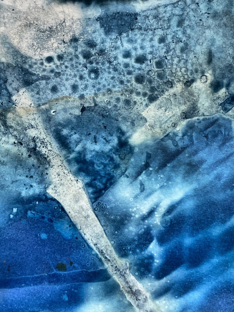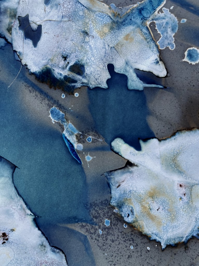 Cyanotypes with their deep blue hues and organic textures, naturally evoke the ebb and flow of water. The marks and silhouettes of found objects tell a layered story, from something quite beautiful to something unsettling about what the river holds beneath. A visual story that explores the fragility of our ecosystems in the face of pollution, drought and climate change.