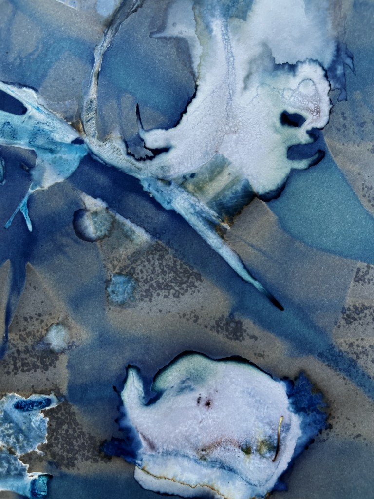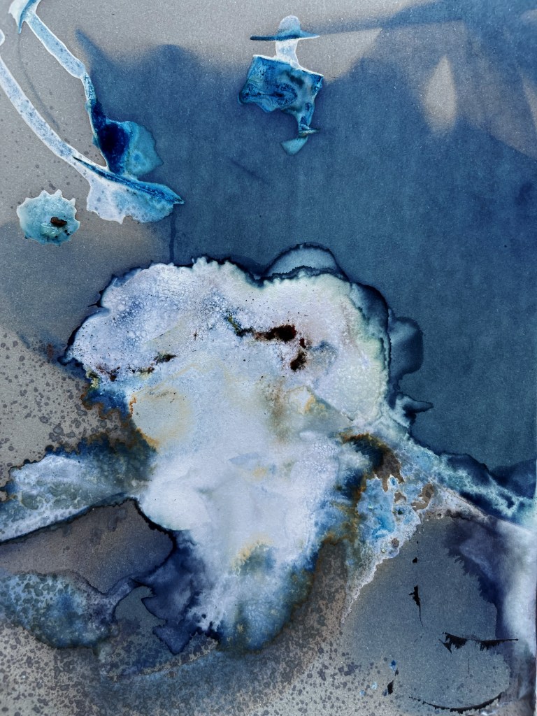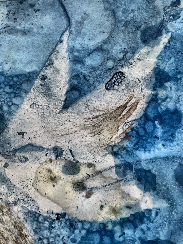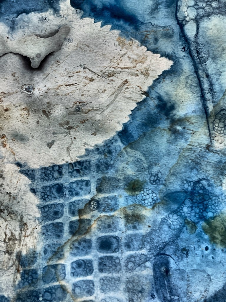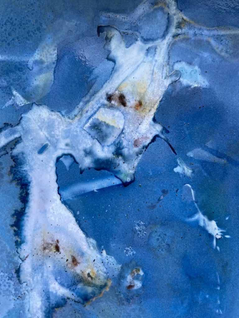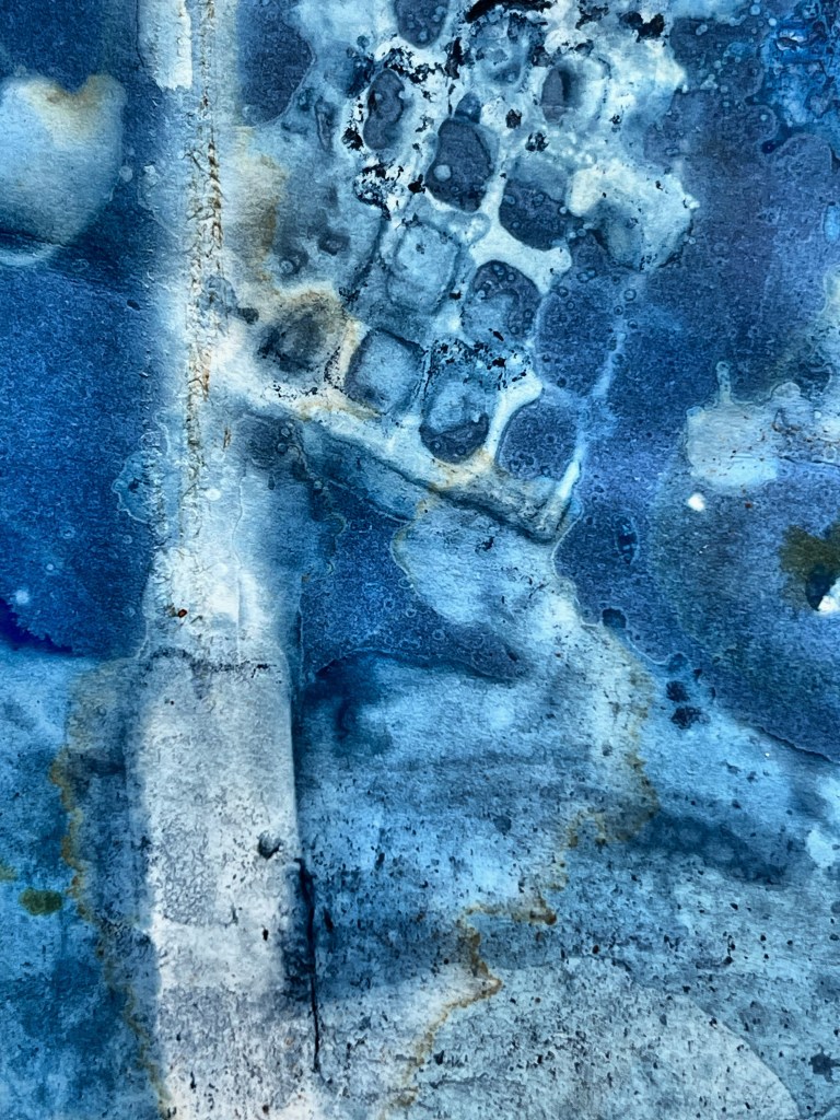 Cyanotypes with their deep blue hues and organic textures, naturally evoke the ebb and flow of water. The marks and silhouettes of found objects tell a layered story, from something quite beautiful to something unsettling about what the river holds beneath. A visual story that explores the fragility of our ecosystems in the face of pollution, drought and climate change.