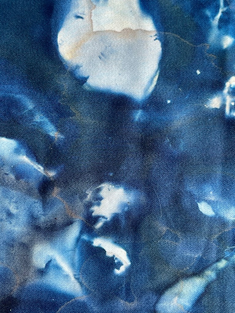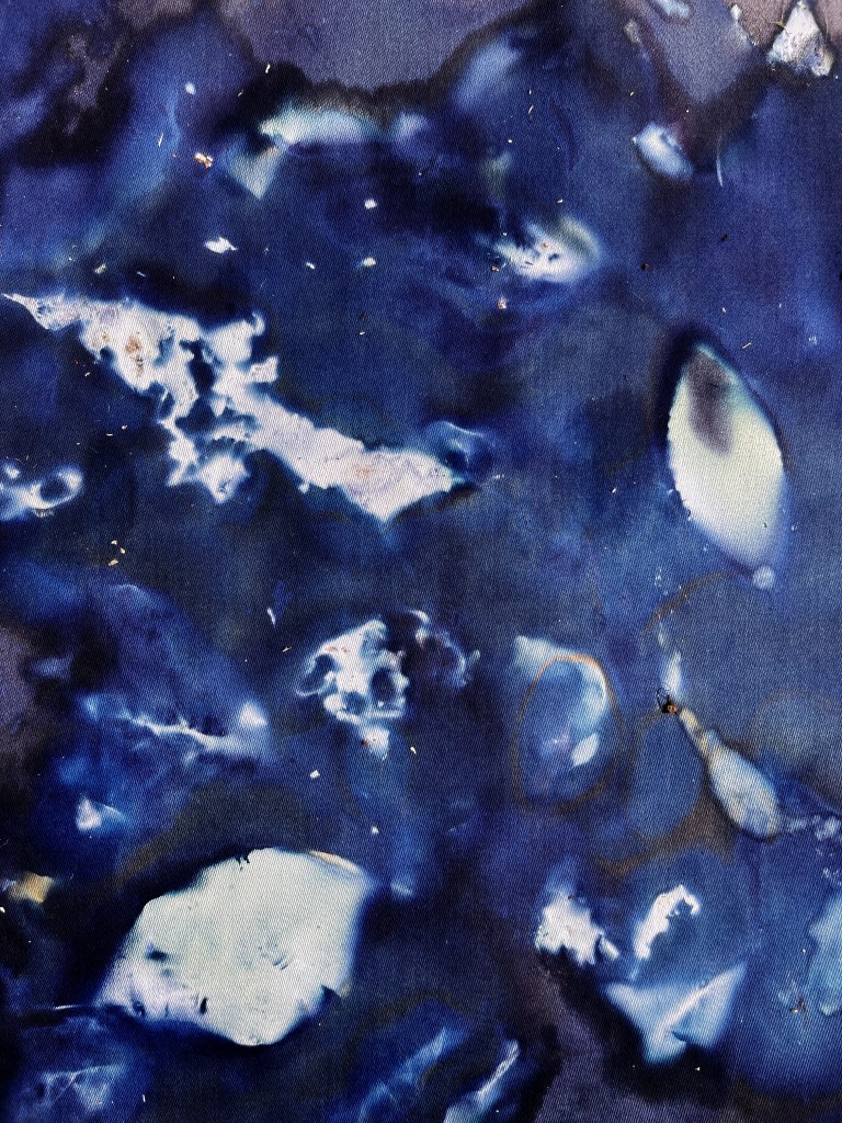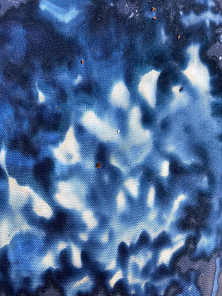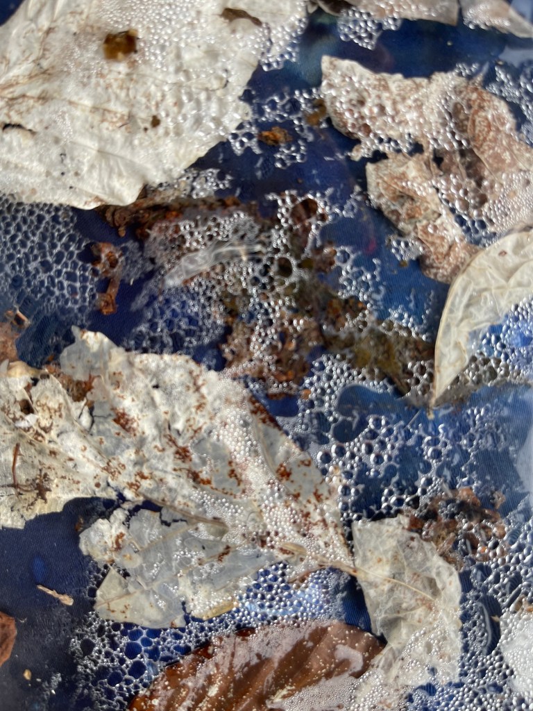 Using the intricacies of the collected natural elements, the skeleton leaves, and drawing on their fragile beauty, weaving in layers of meaning and resilience, and collaborating with the open water and the bright sunlight we are experiencing at the moment (June 2025), I managed to create some different textures and marks during the process of developing the cyanotypes, this time on fabric. Stained with the water and sediment, inviting the river itself, again, to become part of the creative process, embedding its presence into the work. The sifted water carries particles of silt, organic matter and traces of pollution, all of which tells a story within itself. The silt is what is left behind after the flooding and is an important part of the process.