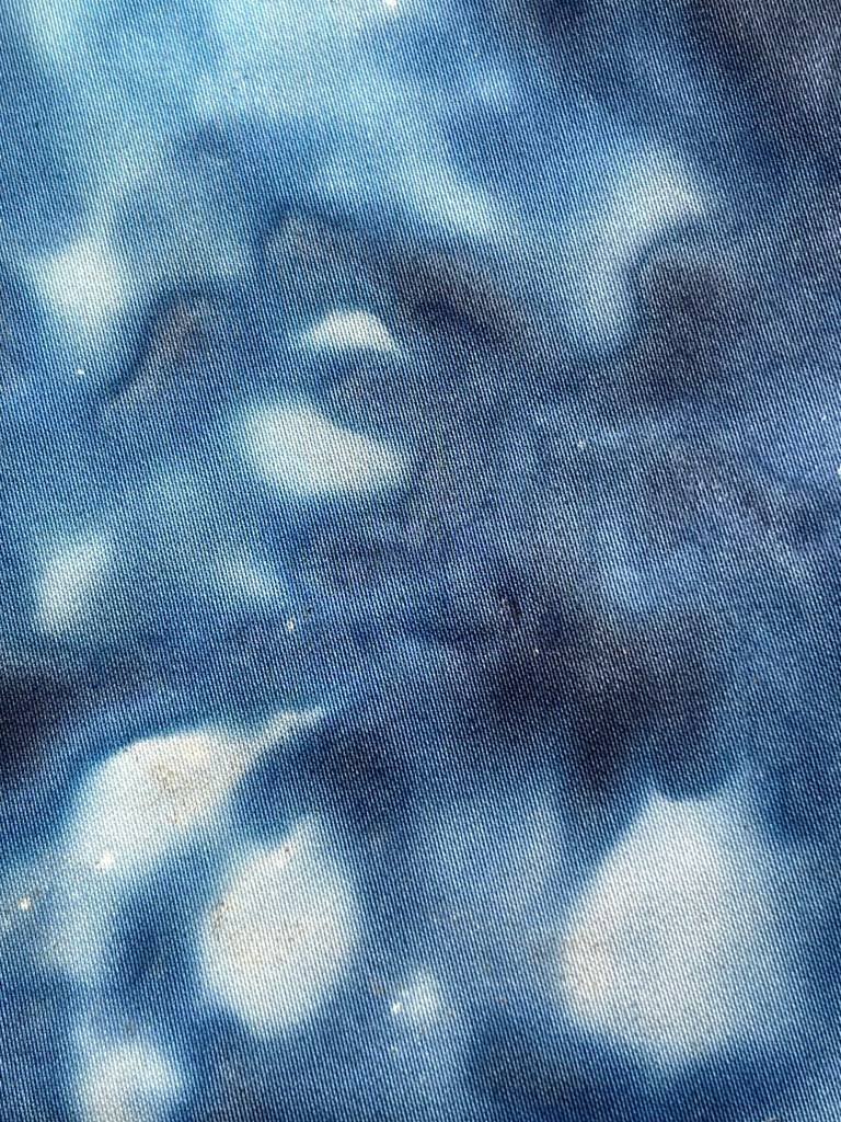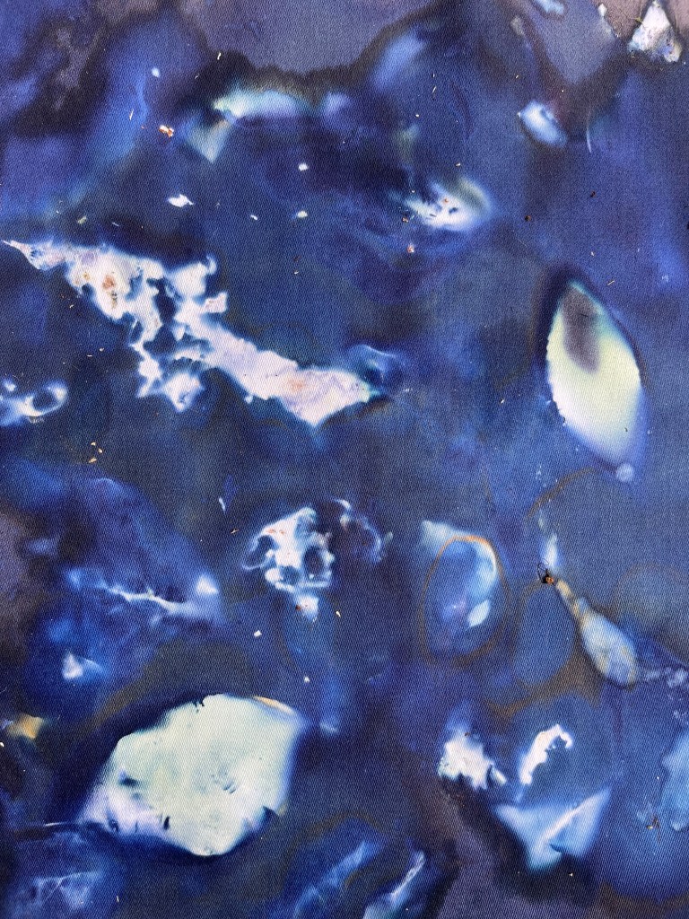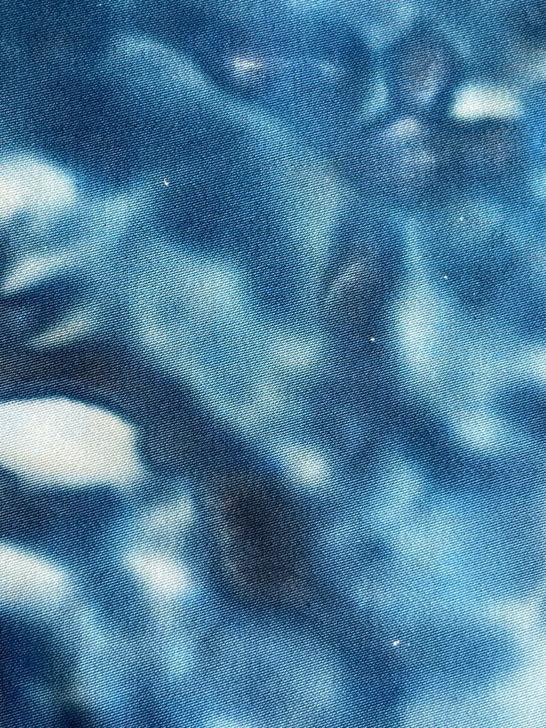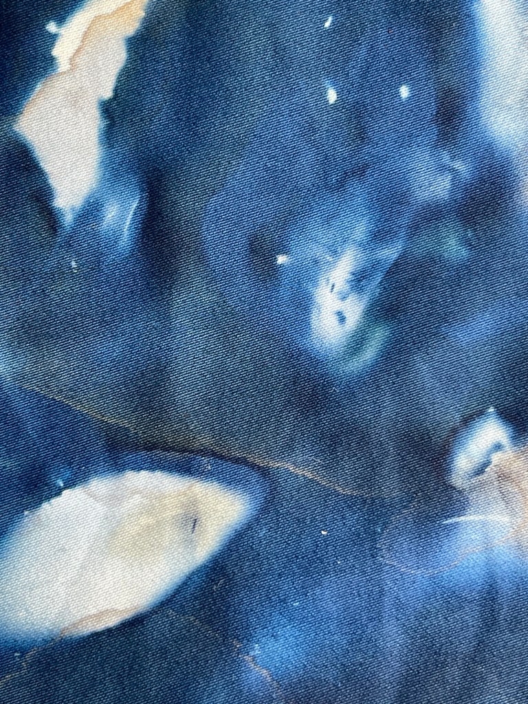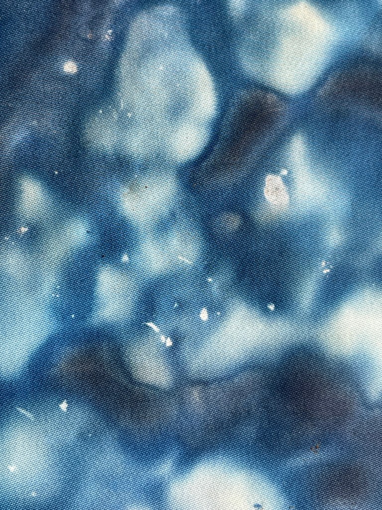 Using the intricacies of the collected natural elements, the skeleton leaves, and drawing on their fragile beauty, weaving in layers of meaning and resilience, and collaborating with the open water and the bright sunlight we are experiencing at the moment (June 2025), I managed to create some different textures and marks during the process of developing the cyanotypes, this time on fabric. Stained with the water and sediment, inviting the river itself, again, to become part of the creative process, embedding its presence into the work. The sifted water carries particles of silt, organic matter and traces of pollution, all of which tells a story within itself. The silt is what is left behind after the flooding and is an important part of the process.