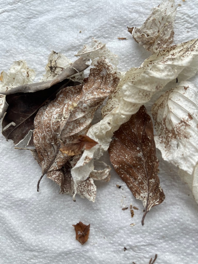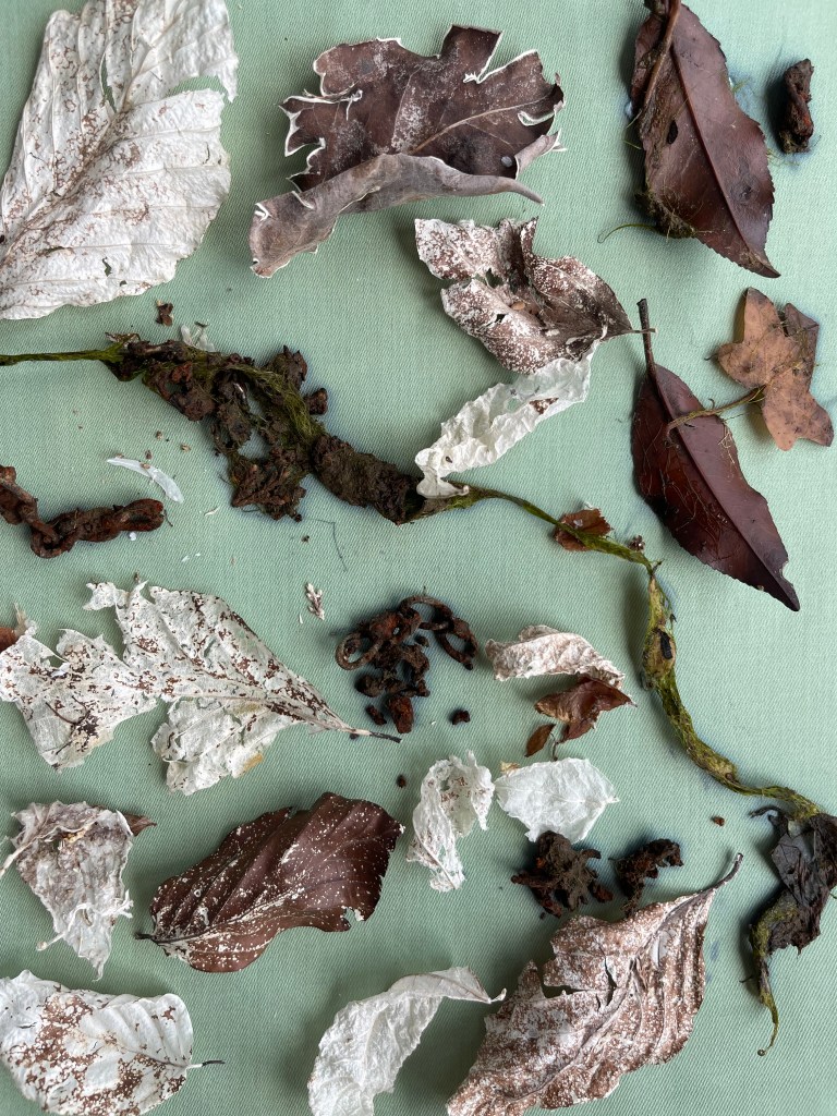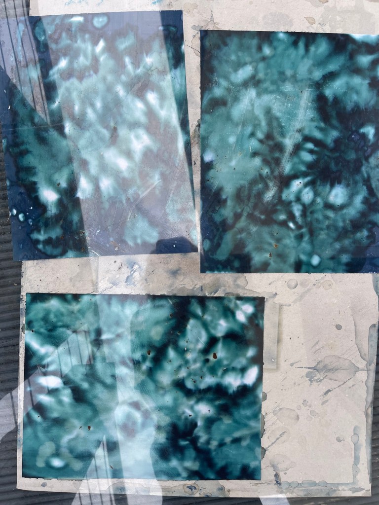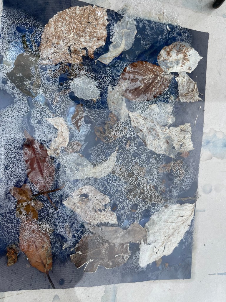 I wanted to re-use the leaves, although so delicate, they survived and had some of the cyanotype dye mixed in with them. They were a greenish colour from the chemicals.