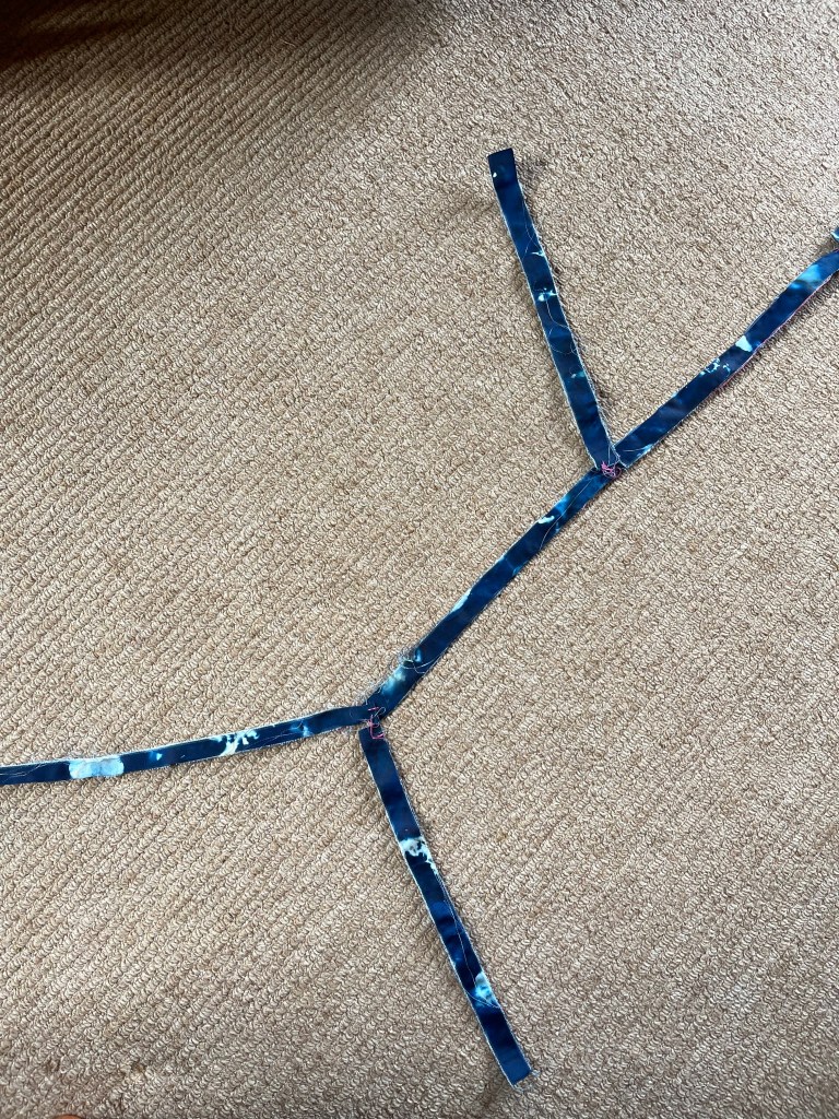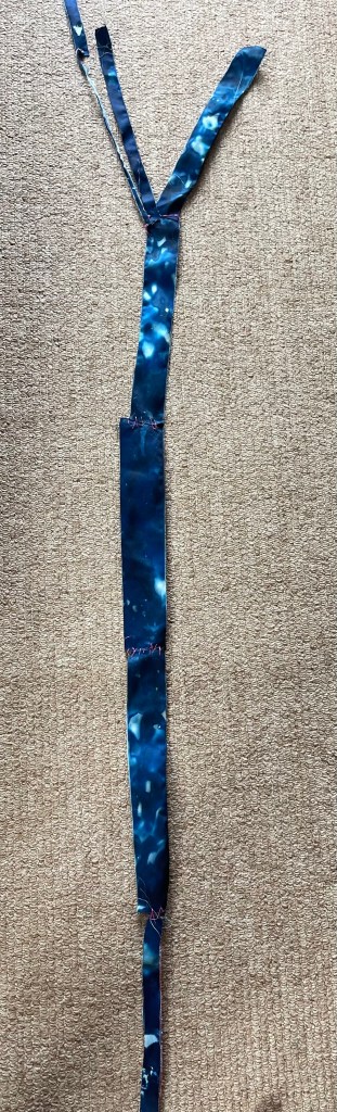 Despite all this fragmentation something whole again can be recreated, our continuous cycle of life, illustrated in each cyanotype as a unique part of adding to the narrative. I wanted to roughly stitch these torn strips of fabric into a weaving, meandering river. The tearing illustrates the aggression, disruption and untidiness the flooding causes, the roughness of the brightly coloured red stitches, illustrate veins or tributaries, overlapping the fabric to evoke a flow, repairing and healing. Piecing things back together as part of an emotional landscape.
