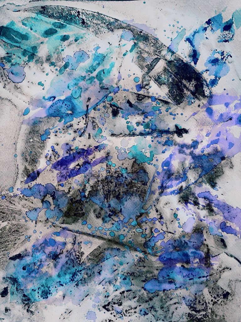 Below – Cool coastal palette built in layers as I try to capture the shifting weight and transparency of the water, the push and pull of the tides. The roughness and bleakness of the surf and the depth of the water. I hope the layers create a sense of movement, mirroring the emotional duality that I feel towards the water, the beautiful immersive, hypnotic experience. The pull of something so vast and alive, the destructiveness, the power and the turbulent sheer force the water has and this fear it has over me.