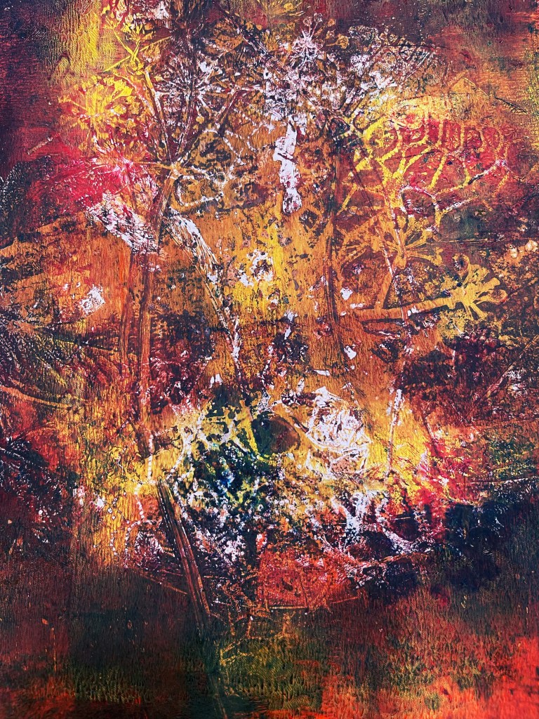 Energy, textures, organic, earthy, a walk through nature, dreaming, movement both above and below, colour, a moment in time, drawn down, drawn up, hot, fiery, cold, destruction of the earth, rough, visual metaphor for my inner tension, battle of above and below, a directional, underwater fight, splashes of water, dark eerie shadows of what lies beneath.
