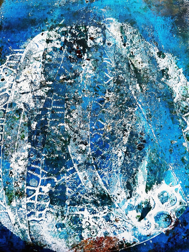 Above – The land holds traces of our out of sync seasons, a warm palette of paint with imprints of nature, which contrast with the fluidity of the sea. The density of texture feels heavy, pressed by the print of a world physically and grounded in contrast to earthy textures to comforting days of warmth.